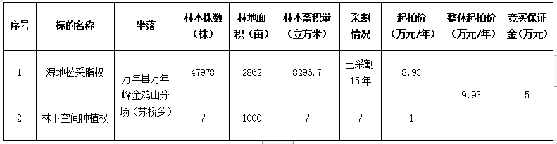 万年县万年峰金鸡山分场2862亩湿地松采脂权和其中1000亩林下空间种植权转让(2年)公告