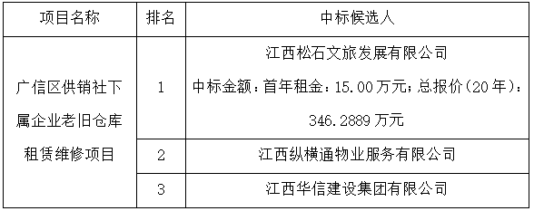 江西省明阳全咨工程咨询有限公司受上饶市广信区鑫业资产经营管理有限公司的委托,就其广信区供销社下属企业老旧仓库租赁维修项目(项目编号:MYQZ2026-0301)采取公开招标方式招标。本项目在江西省公共资源交易平台、上饶市产权交易网、上饶市产权微信公众号发布招标公告。招标活动定于2026年04月10日09:00时(北京时间)截标后在江西省上饶市公共资源交易中心开标室进行。中标候选人排序(前三名):
